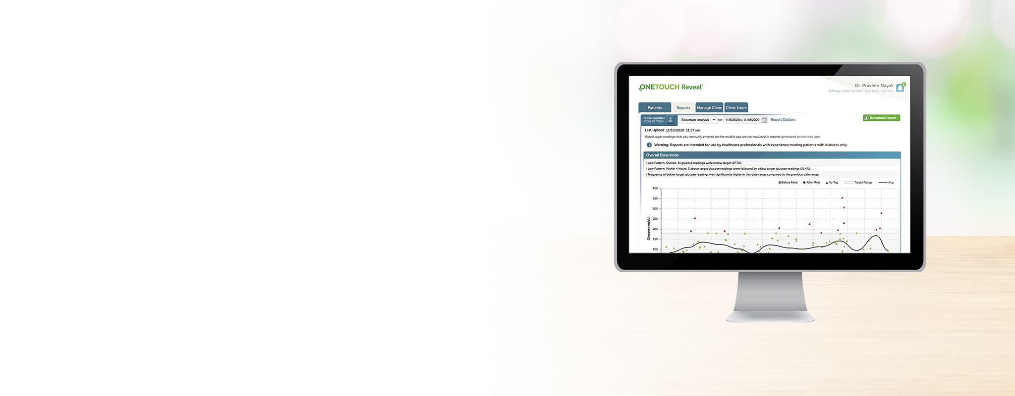 *Based on results of a study conducted in the U.S.A in 2012 with 63 HCPs. that compared speed and accuracy in evaluating blood glucose results using a paper logbook compared to results from a report from the OneTouch Reveal® web app. Reviewing blood glucose results using a report from the OneTouch Reveal® web app was significantly faster and more accurate than using a logbook. HCPs took an average of 14.4 minutes to assess the logbooks and 4.2 minutes to assess the reports from the OneTouch Reveal® web app. a difference of 10 minutes (p<0.0001).